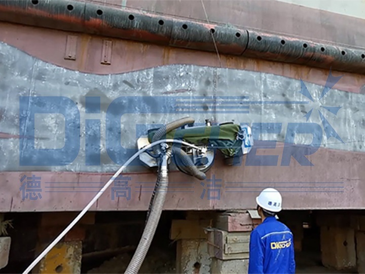 德高潔船體除銹機器人遙控操作方便、自動化程度高,它是將超高壓水射流除銹、真空系統(tǒng)吸附排渣、爬壁機器人作業(yè)三者協(xié)調(diào)于一體,通過地面操作人員手持控制器可以操控除銹機器人在船體外立面上X、Y方向任意行走。