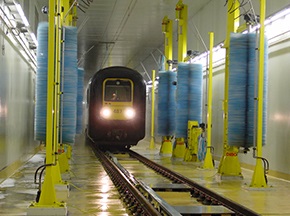 鐵路列車自動清洗機(jī)可實現(xiàn)對列車車廂、火車頭等外面進(jìn)行全面、徹底的自動清洗,設(shè)備主要由噴淋系統(tǒng)、洗刷系統(tǒng)、干燥系統(tǒng)、水處理系統(tǒng)(選配)、預(yù)警系統(tǒng)及控制系統(tǒng)等組成,可通過噴淋濕潤、預(yù)備洗刷、洗滌洗刷、漂洗洗刷和吹掃干燥等不同的清潔方式,配合列車勻速通過清洗工作場地除去列車表面的塵埃和污垢,達(dá)到運營列車潔凈要求。[查看詳情]